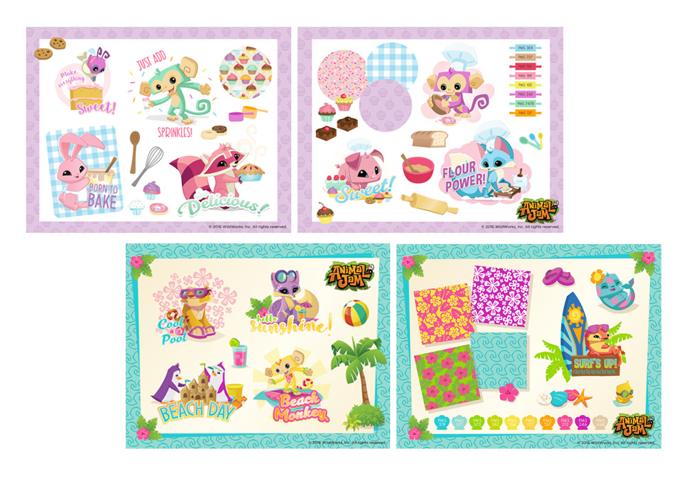 Description: My role at WildWorks, a children’s game developer, was a licensing illustrator. Their game Animal Jam was gaining a lot of momentum and third-party manufacturers wanted to license the brand for merchandise. I created style guides and hook books with the game characters into themes with patterns and spot illustrations.